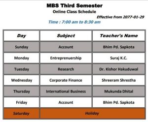 MBS Second Semester को सेमेस्टर परीक्षामा सहभागी विध्यार्थीहरुलाई लक्षित गरी त्रिभुवन विश्वविद्यालयको निर्देशन अनुसार MBS Third Semester को अनलाइन कक्षाहरू मिति २०७७ वैशाख २९ गते सोमबारदेखि निम्नानुसारको कक्षा तालिका बमोजिम सञ्चालन हुने व्यहोरा सम्बन्धित सम्पूर्णमा जानकारी गराइएको छ।